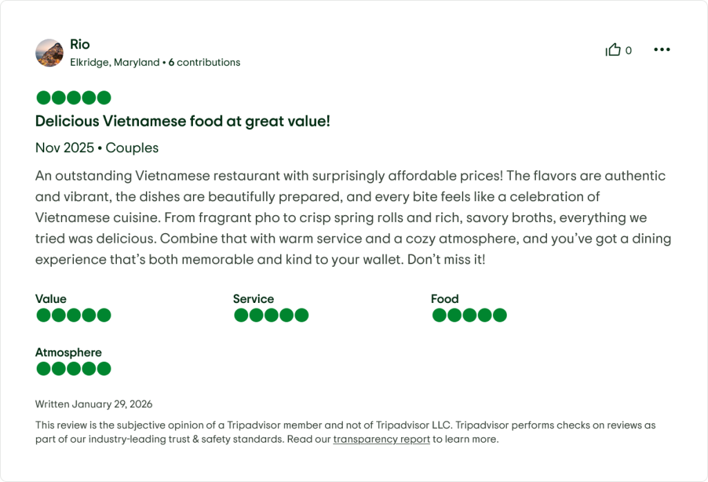 “As a vegan, I rarely find truly satisfying Vietnamese meals abroad—but here, they offered me a full 4-course tasting menu with zero compromise. The ‘Phở Chay’ (vegetarian pho) was soul-warming.” — U.S. traveler, Dec 2025