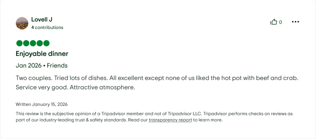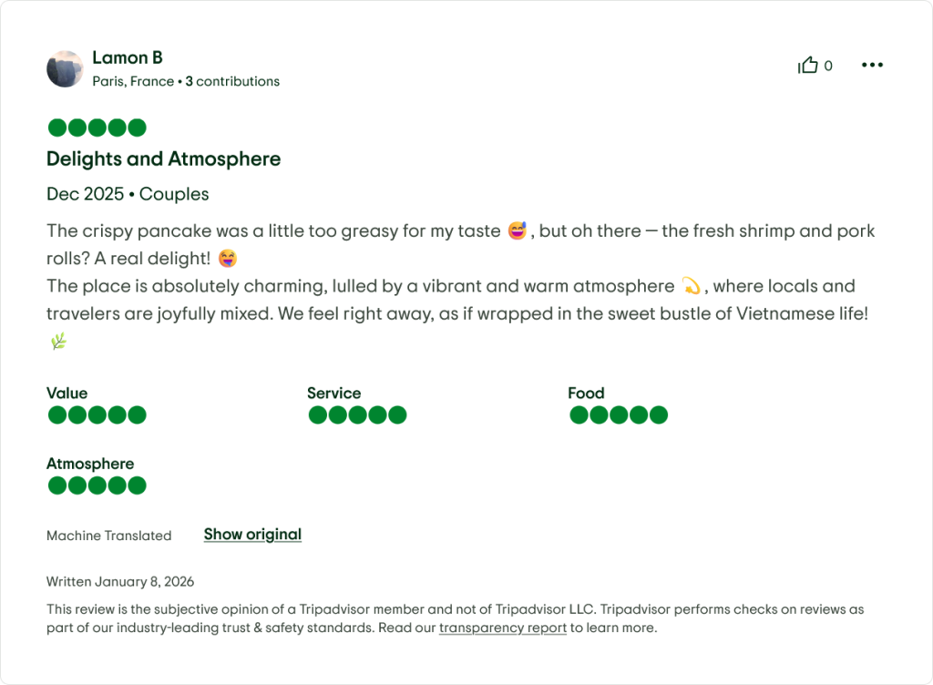 • “Great value for the quality. We spent ~VND 650,000 (~$27) for 2 mains, 2 drinks, and dessert—and left completely satisfied.” — Canadian solo traveler