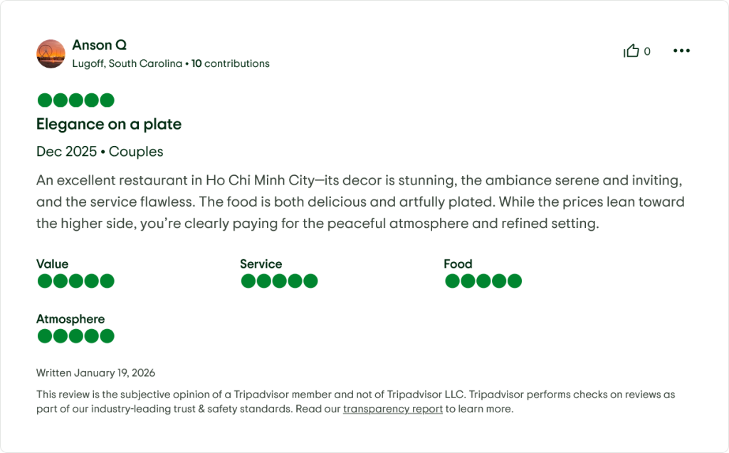 Many guests post photos with hashtags like #SaigonHiddenGem, #VietnameseFoodie, and #TravelersChoiceVN — and yes, the lighting is Instagram-perfect.