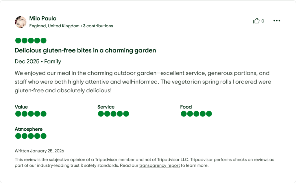 • “The garden setting made our anniversary dinner magical. Service was warm without being intrusive. Food arrived hot, fresh, and beautifully plated.” — Singaporean couple